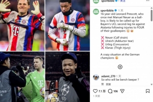 RMC:拜仁16岁门将普雷斯科特几周前担任球童,如今有望出战欧冠