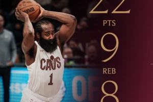 骑士官方晒出了本场哈登数据海报,写道:“大胡子复出并奉献了一场经典的表演。”