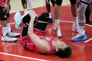 比赛第四节的一次广州反击中,郭艾伦持球对抗上篮,但左膝一软倒地,随后郭艾伦捂着左膝长时间未起,比赛进入暂停。