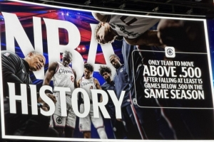 目前快船战绩为33胜32负。赛后,快船主场大屏晒出一项数据:快船是NBA历史首支在一个赛季此前距离五成胜率15场比赛,仍能打回五成胜率以上的球队!